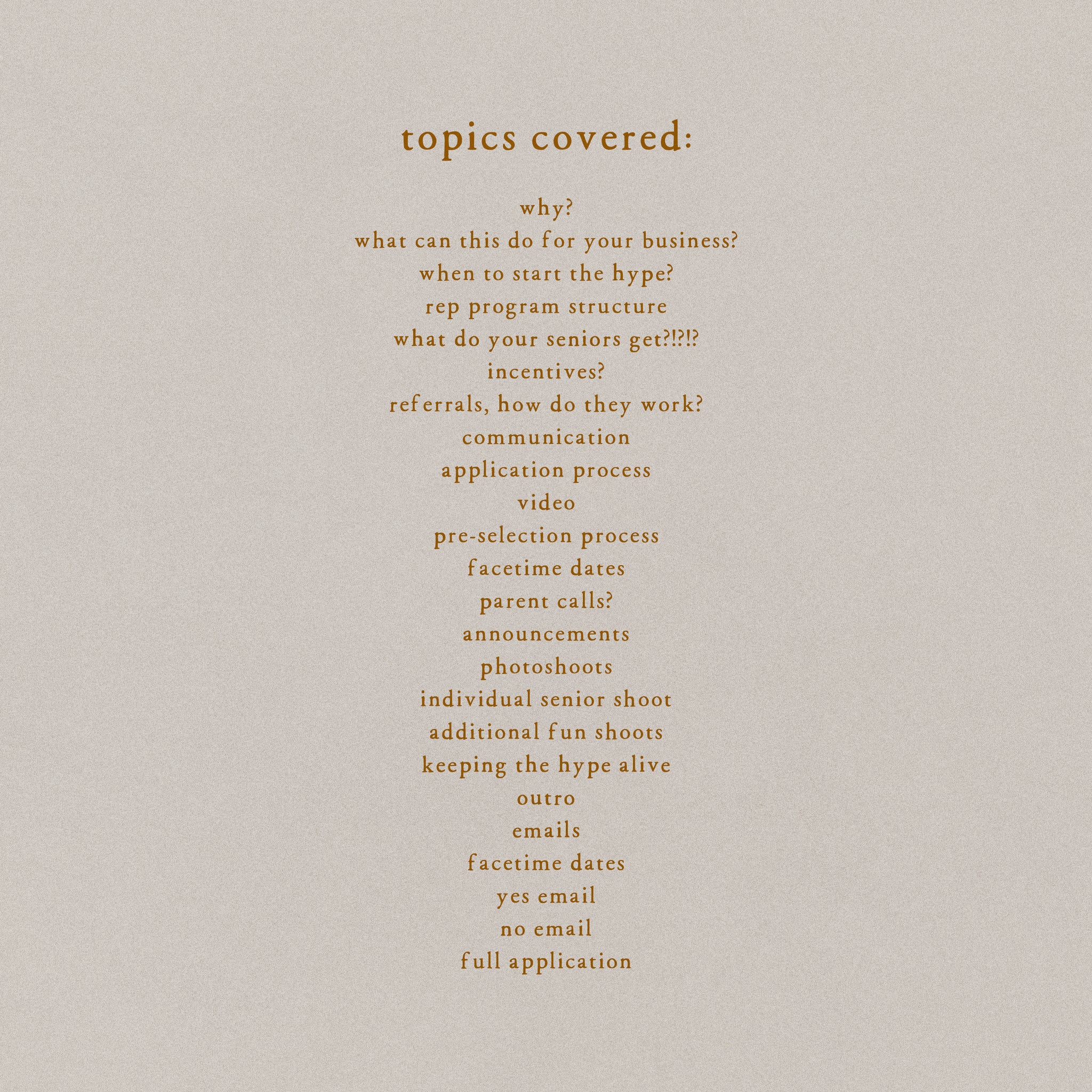 I am so happy you are getting ready to purchase my Senior Rep guide! This guide will help you from start to finish. From how to pick candidates, what to look for, how to create a solid hype team, what photo shoots to plan, when, where, how I layout parental guidelines, how to get your team excited and motivated etc. It's ALL IN HERE! I love teaching and helping my fellow photographers in anyway that I can. That being said- I left NOTHING out! I even have pre-written emails that you can straight up use or adjust to your liking.